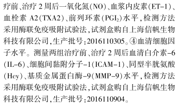 摘要:目的探讨养心颗粒联合西药治疗不稳定型心绞痛(UAP)效果及对患者血管内皮功能及炎性因子的影响。方法选取河北省秦皇岛市中医医院2017年1月~2019年1月收治的158例UAP患者,按随机数字表法分为单一组与治疗组,单一组79例采用西药治疗,治疗组79例采用养心颗粒+西药治疗,治疗2周。观察两组疗效、中医证候积分、血管内皮功能及血清细胞因子水平。结果治疗后,治疗组的临床症状和心电图疗效均显著优于单一组(P <0.05)。治疗后,两组胸闷、胸痛、心悸、乏力、自汗、头晕眼花、面色苍白、神疲懒言各项积分均显著低于治疗前(P <0.05),且治疗组低于单一组(P <0.05)。治疗后,两组的一氧化氮、前列环素水平显著高于治疗前(P <0.05),血浆内皮素、血栓素A2水平显著低于治疗前(P <0.05),且治疗组变化幅度大于单一组(P <0.05)。治疗后,两组血清白介素-6、细胞间黏附分子-1、同型半胱氨酸、基质金属蛋白酶-9水平显著低于治疗前(P <0.05),且治疗组低于单一组(P <0.05)