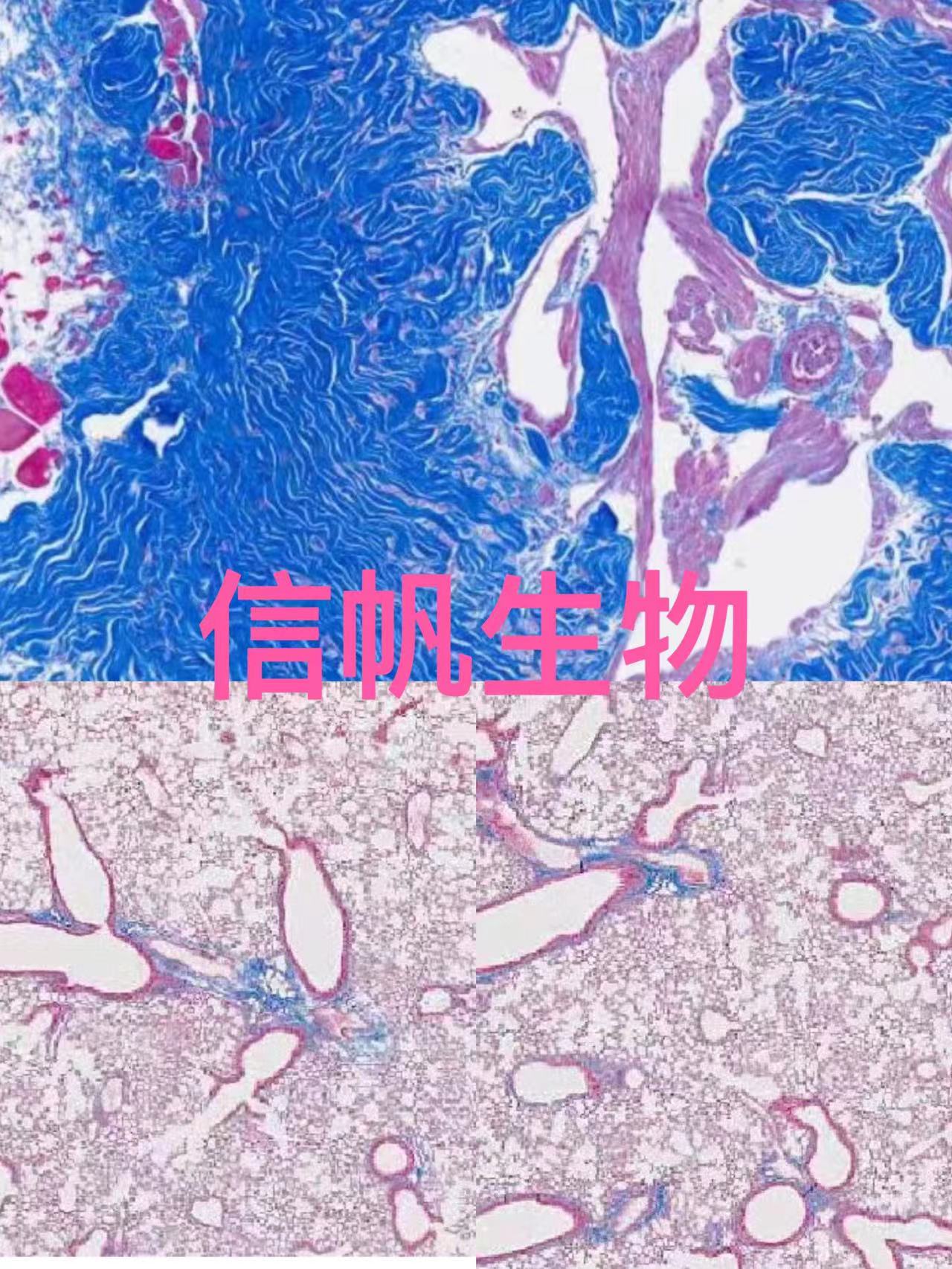 Masson染色是用于显示组织中纤维的染色方法之一,用于胶原纤维染色权威而经典的技术方法。一般是用两种或三种阴离子染料混合,胶原纤维呈蓝色,肌纤维,胞质,纤维素 角蛋白红细胞呈红色,细胞胞核呈蓝褐色。用来显示组织中纤维以及炎性因子的染色方法之一。