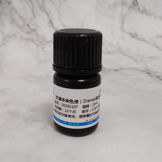 支原体染色液(Dienes染色液)是一种经典的利用天青美蓝染色检测支原体污染的试剂,经常用于培养的贴壁或悬浮细胞以及组织切片的细胞凋亡检测,该试剂检测细胞含量范围一般为0.1~1×106之间,Dienes染色液亦可用于泌尿生殖道感染细菌的染色鉴别。