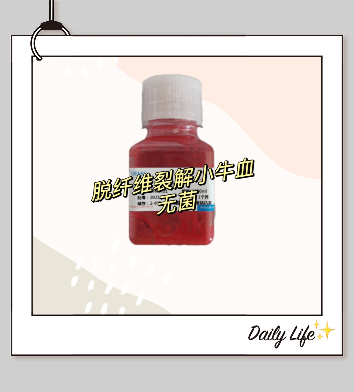血清是由血浆去除纤维蛋白而形成的一种很复杂的混合物,其组成成份虽大部分已知,但还有一部分尚不清楚,且血清组成及含量常随供血动物的性别、年龄、生理条件和营养条件不同而异。血清中含有各种血浆蛋白、多肽、脂肪、碳水化合物、生长因子、激素、无机物等,这些物质对促进细胞生长或抑制生长活性是达到生理平衡的。